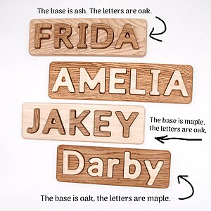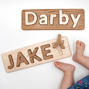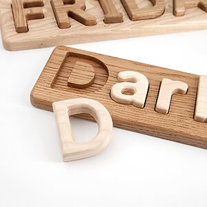 Our puzzle is made of solid oak, ash, or maple. The letters are carefully sanded and waxed for protection. The wooden puzzle will be a great helper in learning his / her name.